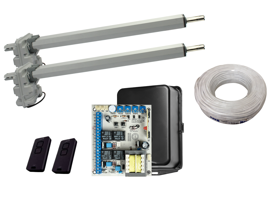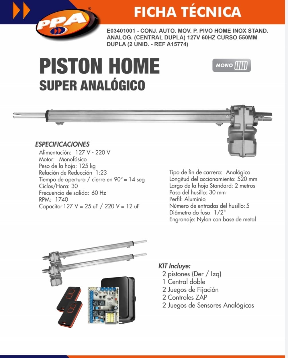 Automatizador para portones pivotantes residenciales de hasta 125 kg (en cada hoja), pudiendo hacer hasta 30 ciclos (apertura y cierre) por hora. Tiene un carril centralizado (acoplado en el centro del motorreductor), pudiendo ser instalado en cualquier lado de la hoja del portón.